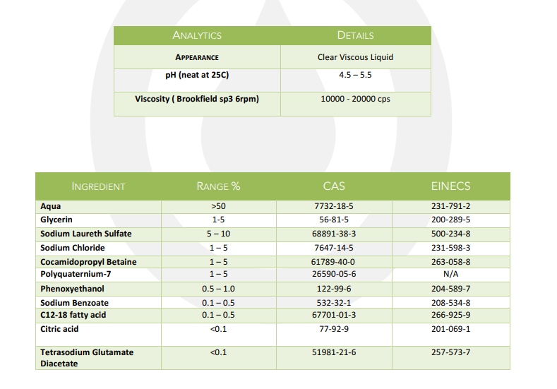 Aqua, Sodium Laureth Sulfate 5, Sodium Chloride, Glycerin, Cocamidopropyl Betaine, Phenoxyethanol, Sodium Benzoate, Citric Acid, Polyquaternium, Tetrasodium Glutamate Diacetate