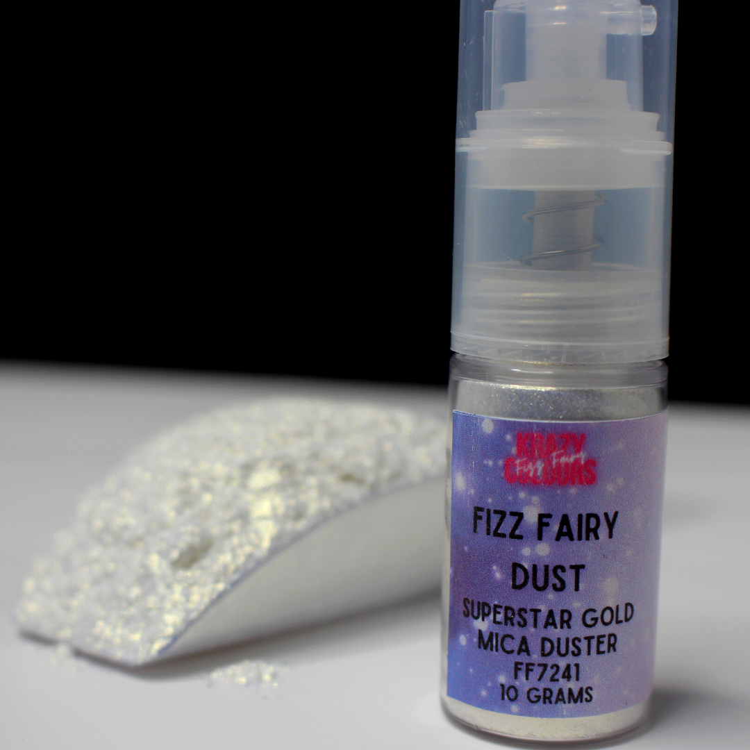 This mica duster is filled with our beautiful Superstar Gold Mica Powder. This mica powder is silver in colour but when sprayed onto products reflects gold.