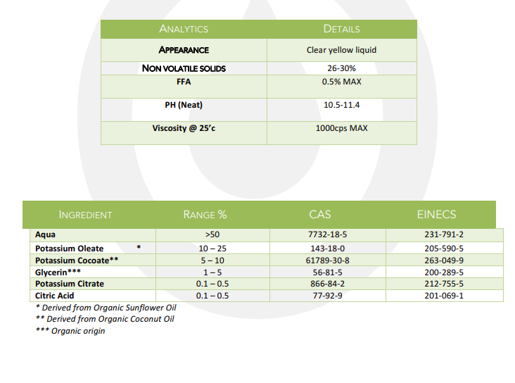 Aqua, Potassium Oleate*, Potassium Cocoate**, Glycerin***, Potassium Citrate, Citric Acid