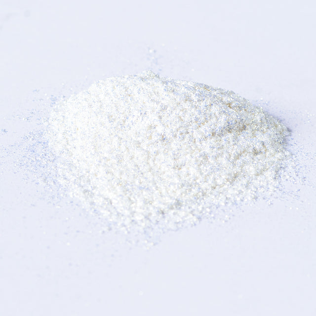Sparkly White Powder with a gold reflection, high sheen and low coverage.