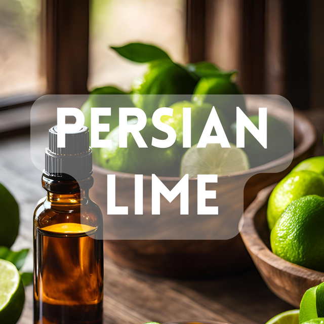 Cold-Pressed Persian Lime Essential Oil, an essential oil sourced from Mexico, extracted by cold-pressing fresh lime peels. It is dark green in colour and has the characteristic, strong, sweet-tart aroma of fresh limes.