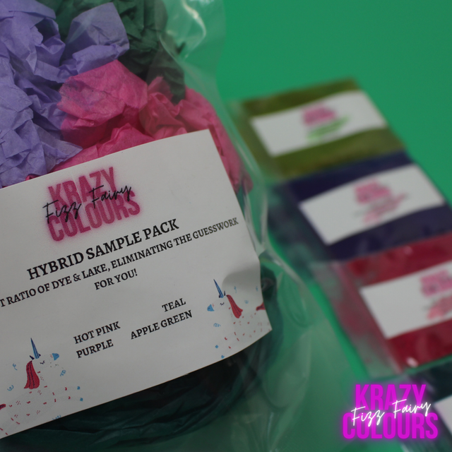 This pack includes 4 premium Hybrid samples. The perfect ratio of dye & lake mixed to make your dreams come true! Who says you need to pick one or the other, get brightly coloured bathwater and vibrant bath bombs using this magic combo!