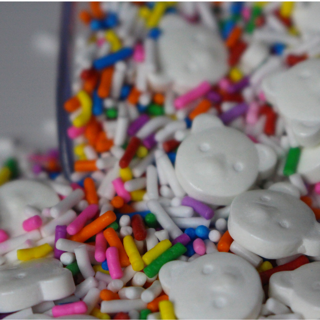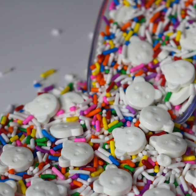 Top off your bath bomb & soap creations with these fun candy sprinkles! Eye-catching confetti cake sprinkles with adorable white polar bear heads mixed throughout.